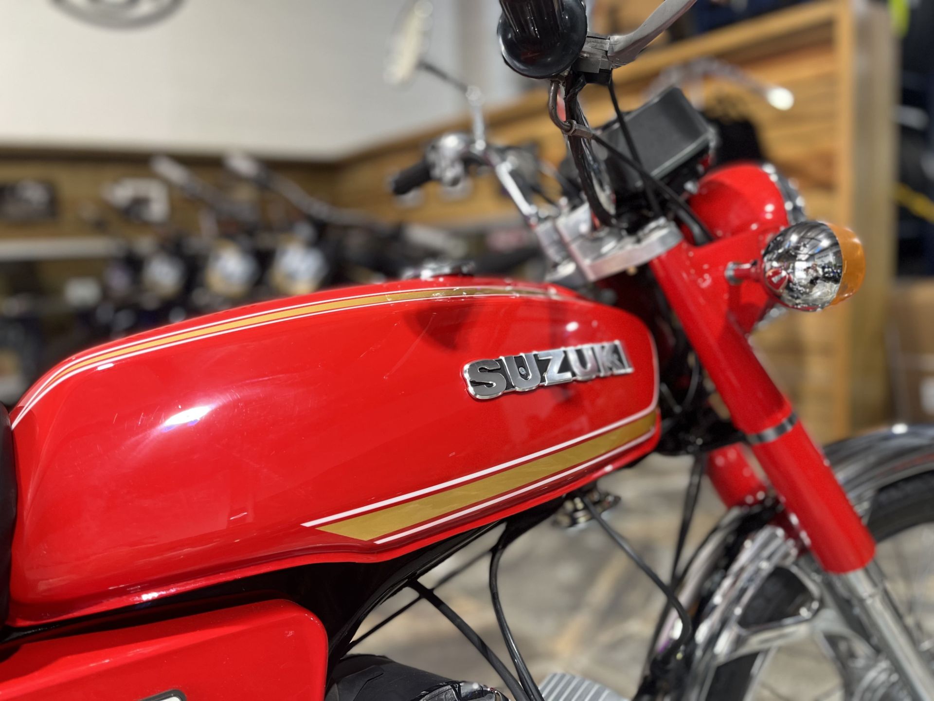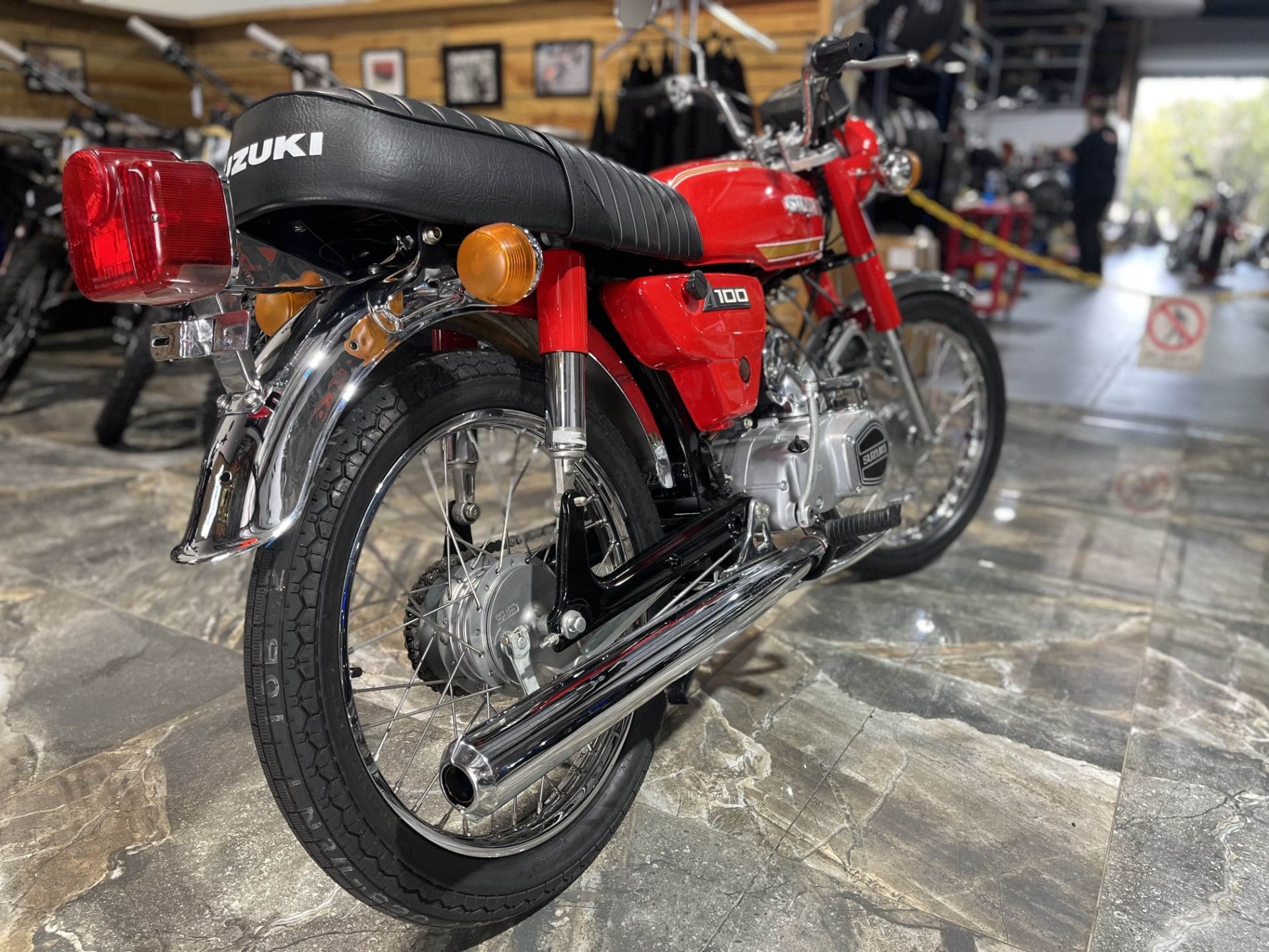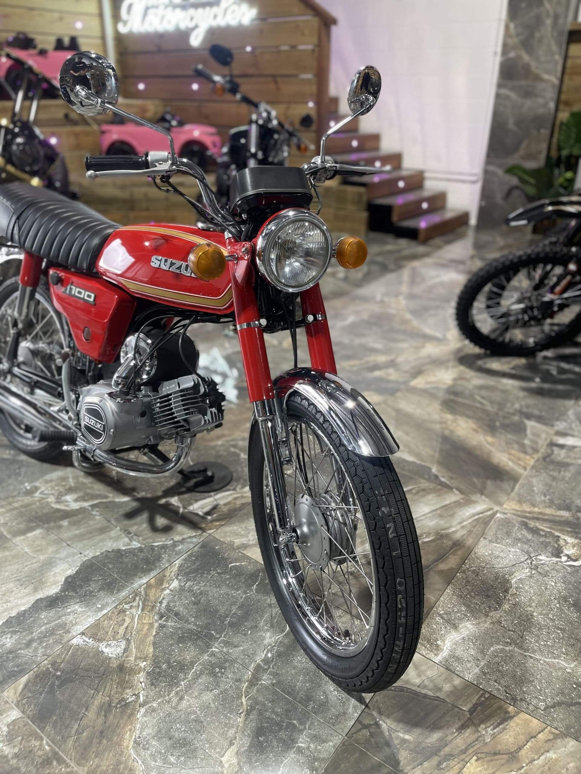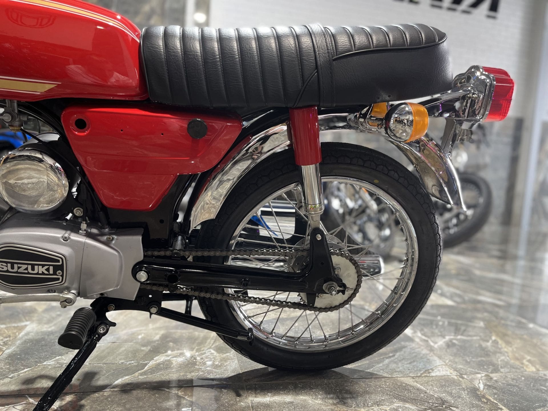 As one of our custom motorcycles in Brisbane, this Suzuki A100 received a complete overhaul – fresh paint for the frame, fuel tank, and side covers in the exact paint scheme and colours the bike would have rolled off the showroom floor 50 years ago.