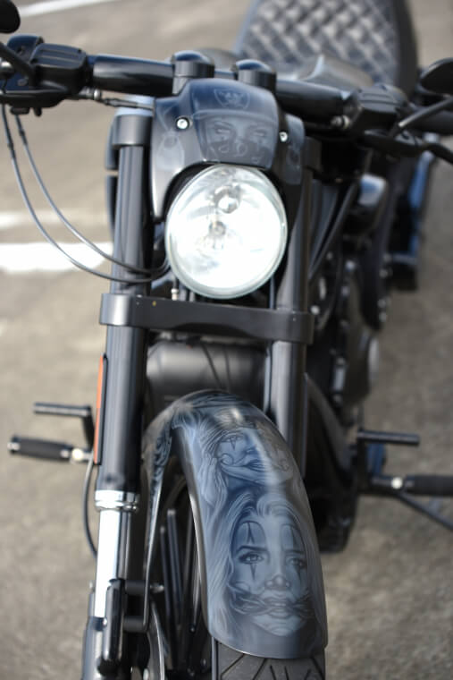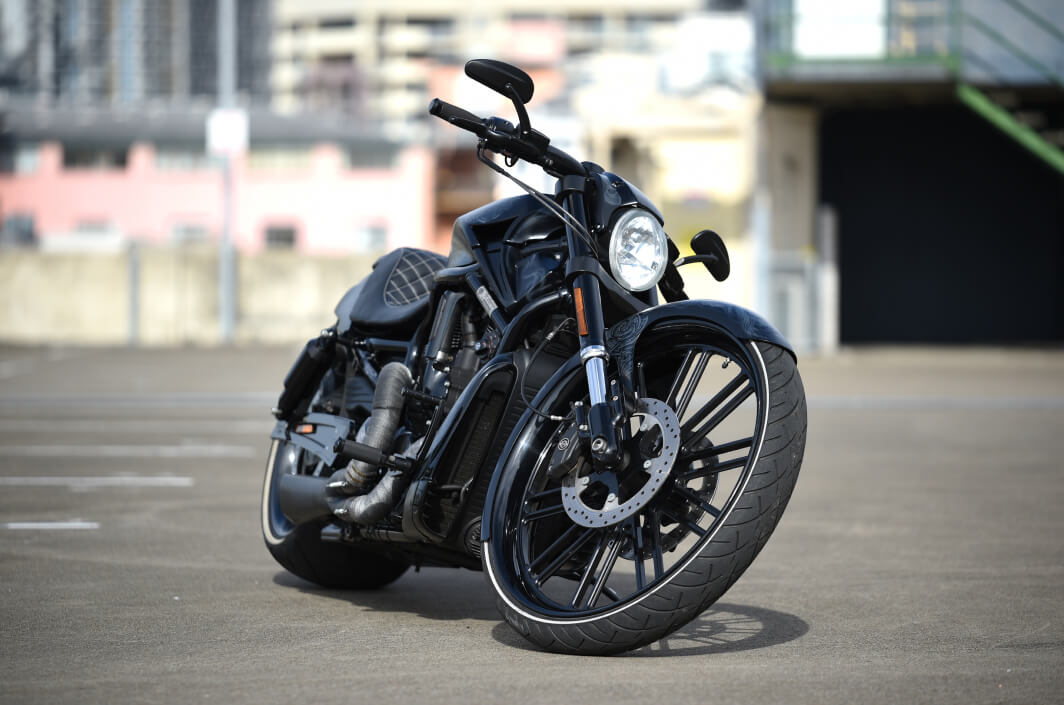This bike was a stock 2014 Nightrod when it came to us. We began the build by sourcing a DGD 300 swingarm and wheel combo, a clean tail tidy and indicator combo which drastically changed the look of the rear end. Up front a matching 26”NRS style wheel and one off raked triple tree set was fitted. This wheel combo was then wrapped in a set of our most trusted and aggressively styled tyres, the Avon cobra chromes. These tyres are available for most makes and models and come highly recommended. As always we won’t compromise on the finish of our bikes and we took and RWD front fender, split it done the middle and cut 15ml out, welded it back together and then hand finished before being prepped for paint. This created a nice tight, tucked guard around the 26” front wheel.
