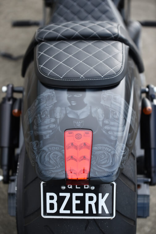 Next we sourced a set of 18” tall, 2”diameter Burleigh highballs and risers from our friends at Burleigh Bars in gloss black. These along with internal wiring and a sleek indicator and mirror combo made the riders controls as tough as the rest of the bike while ensuring our 6ft tall customer achieved maximum comfort in the perfect riding condition. Because of the bar and riser combo we next had to relocate the instrument cluster. The boys at DGD hooked us up once again with one of their custom air boxes which allowed us to move the instruments into the top of the airbox cover and keep the top of the bars clean. With a bike as staunch as this there was only one possible colour we could go with. Satin black with some subtle gunmetal grey lettering made this bike look clean and smooth.
