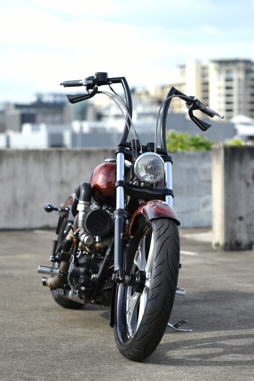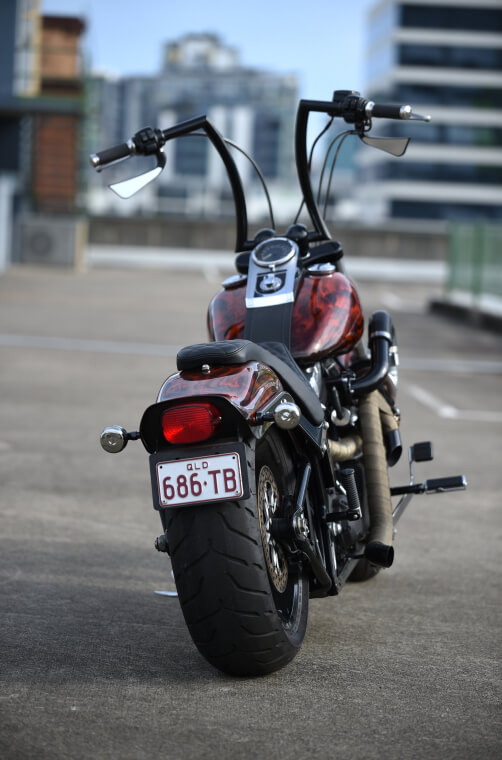 All covers were removed and blacked out along with the back rim. The engine, gearbox and primary combo was masked up in house and painted in factory texture black paint. An Arlen Ness lowering kit slammed the rear end an inch and a half. After we refined the lines of the RWD front fender we once again had Deathwish hook us up with an incredible skull and flame airbrush job.