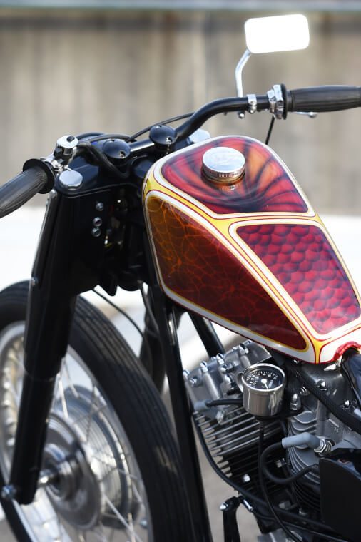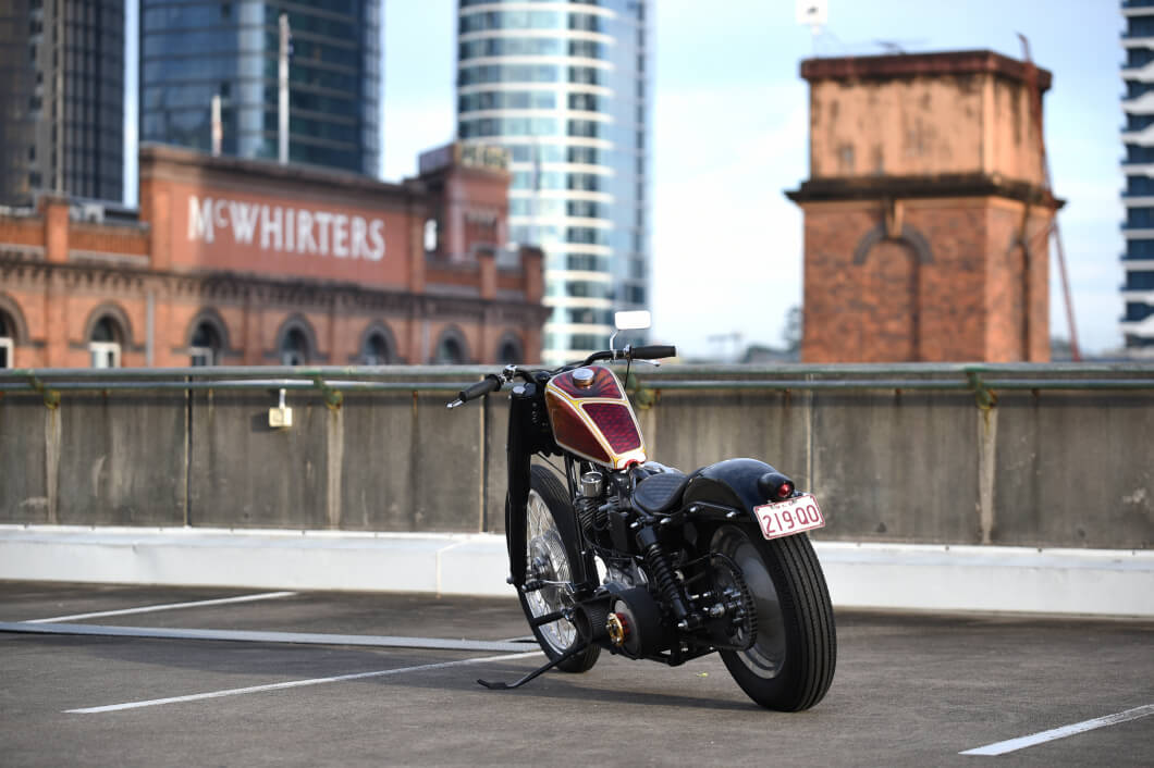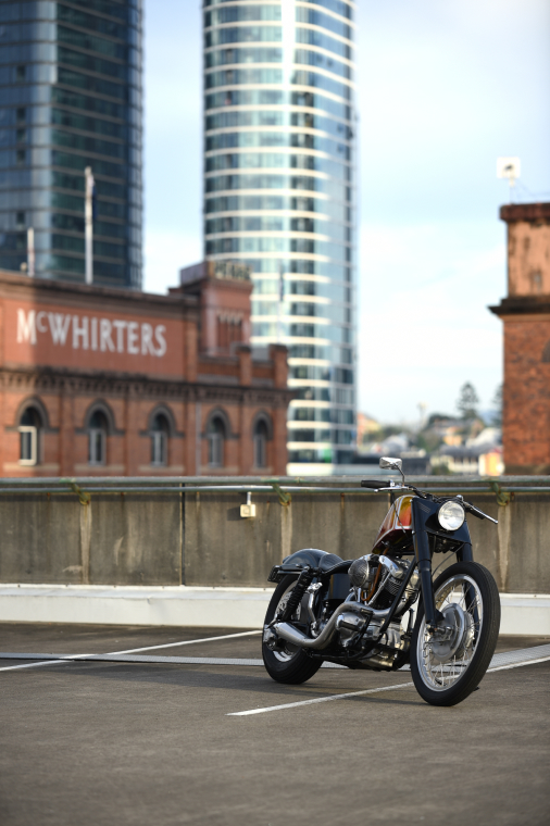 It was built on the cheap, using as many second hand parts as possible. As Joe is a true traditionalist, this bike was built as a true hot rod using non brand name parts and only using parts from other models or hand made components. Starting with a 1958 panhead frame which came to us badly damaged. A few repairs and he had a solid base to build his bike.