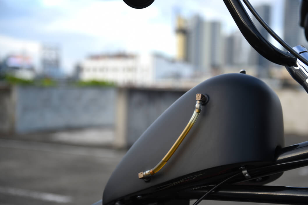 Matt himself has sourced a beautiful hand tooled leather seat with his own personal design and we were tasked with working out some sleek clean mounts for it. Once again Matt and Joe collaborated on the centrepiece – the fuel tank. Matt painstakingly drilled brass fittings to look like dice and then Joe took over and made the bungs for the tank and finish the bespoke look by hand tie wiring the fuel site tube. Along the process Joe almost blew this tank in half (haha….) but he fixed it and you’d never know if we hadn’t announced it here! But you live and you learn!