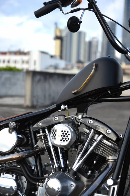 The boys wanted to build a rideable, reliable, radical chopper with as many bespoke parts as possible. The custom frame built by Dunrite Cycles provided an excellent platform with a bit of extra rake and stretch in the frame as well as the ability to run a standard softail 5spd gearbox behind the 80cui shovel engine. We had the legendary Paul Taverner rebuild both the gearbox and the engine inside and out, top to bottom. We don’t cut corners on our builds and this ensured the bike was starting out in peak condition.