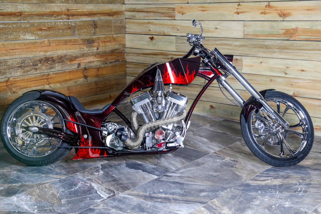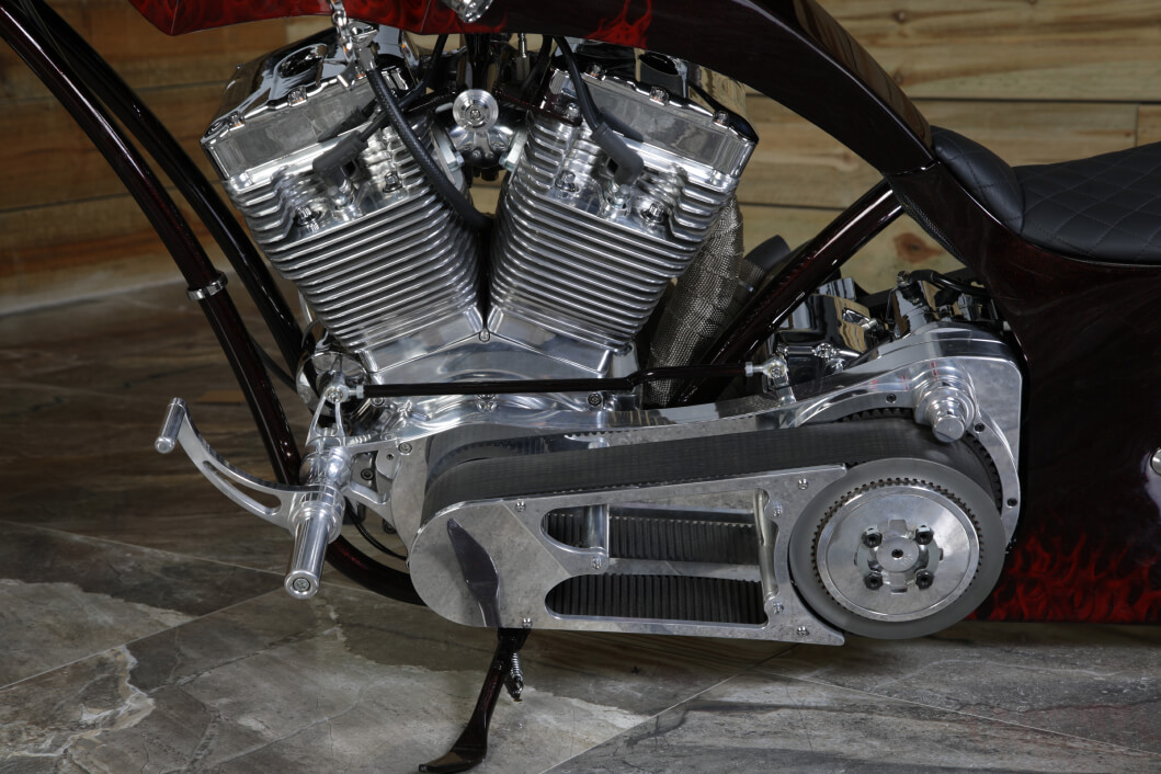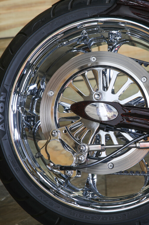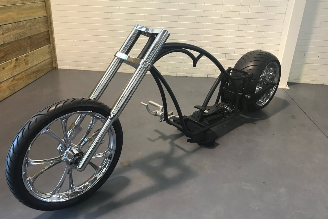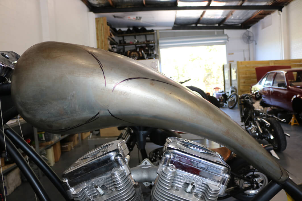 This build started as a Low Life chassis from the US. As this came without any tins and the chassis wont accept any standard fitment we had to fabricate all of tins and bodywork ourselves. The fuel tank was hand rolled form 14 pieces of steel on our English wheel, along with the headlight. The front and rear fender were formed from blanks which allowed us to add our own style lines. The main drive chain consisted of a 127” El Bruto engine, 6 speed Gearbox and independent MC Worx open belt drive.